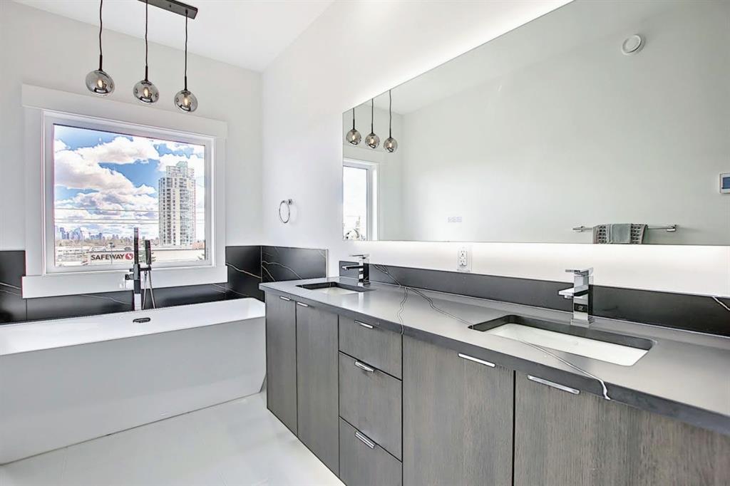 This upscale 3-storey dream home is centrally located on the Westside of Calgary in the inner-city community of Rosscarrock. The unit is located on the back Northside of the building, offering 2125 sqft of developed living space with both views of the community as well as downtown Calgary. It’s M-C2 zoning make it uniquely suited for home-based businesses or a work from home lifestyle. Main floor features a spacious open concept layout with 10-foot ceilings, large windows draw in natural light and stunning engineered oak hardwood floors. Gourmet kitchen is equipped with a European Blomberg appliance package, premium quartz countertops/backsplash, and a large island with a double waterfall feature. The living area is centered around a gas fireplace with marble tile surround, leading to a large deck with a gas BBQ hookup. Luxurious finishes throughout include heated tile floors & sound-enabled backlit LED mirrors in bathrooms, solid 8′ doors and a built in Bluetooth speaker system. Second and third levels offer double primary suites and a third-floor flex room with its own wet bar and a private deck overlooking the community. The second-floor primary suite offers a large walk-in closet and spa-inspired ensuite (jetted tub, shower, double vanities). A second large bedroom and laundry room can also be found on this level. The third-floor primary suite features a private deck with downtown views and a gorgeous ensuite. Building is professionally managed, reasonable condo fees – move in and enjoy a maintenance-free lifestyle. Single attached garage is roughed in with an Electric Vehicle charging station + another parking spot on your driveway. No permits are required for additional street parking. High efficiency furnace, tankless hot water system, central A/C + humidifier. Impressive curb appeal with high-end modern exterior finishes & architectural design. This incredible home is located within a few minutes commute to downtown Calgary, steps from major amenities including Westbrook Mall, Starbucks, Safeway & Walmart. Steps to Westbrook Mall LRT Station and major transit routes. Located within proximity to a Nicholls Family Public Library, Shaganappi Point Golf Course, an aquatics center, bike & walking paths, schools and local shops and restaurants.